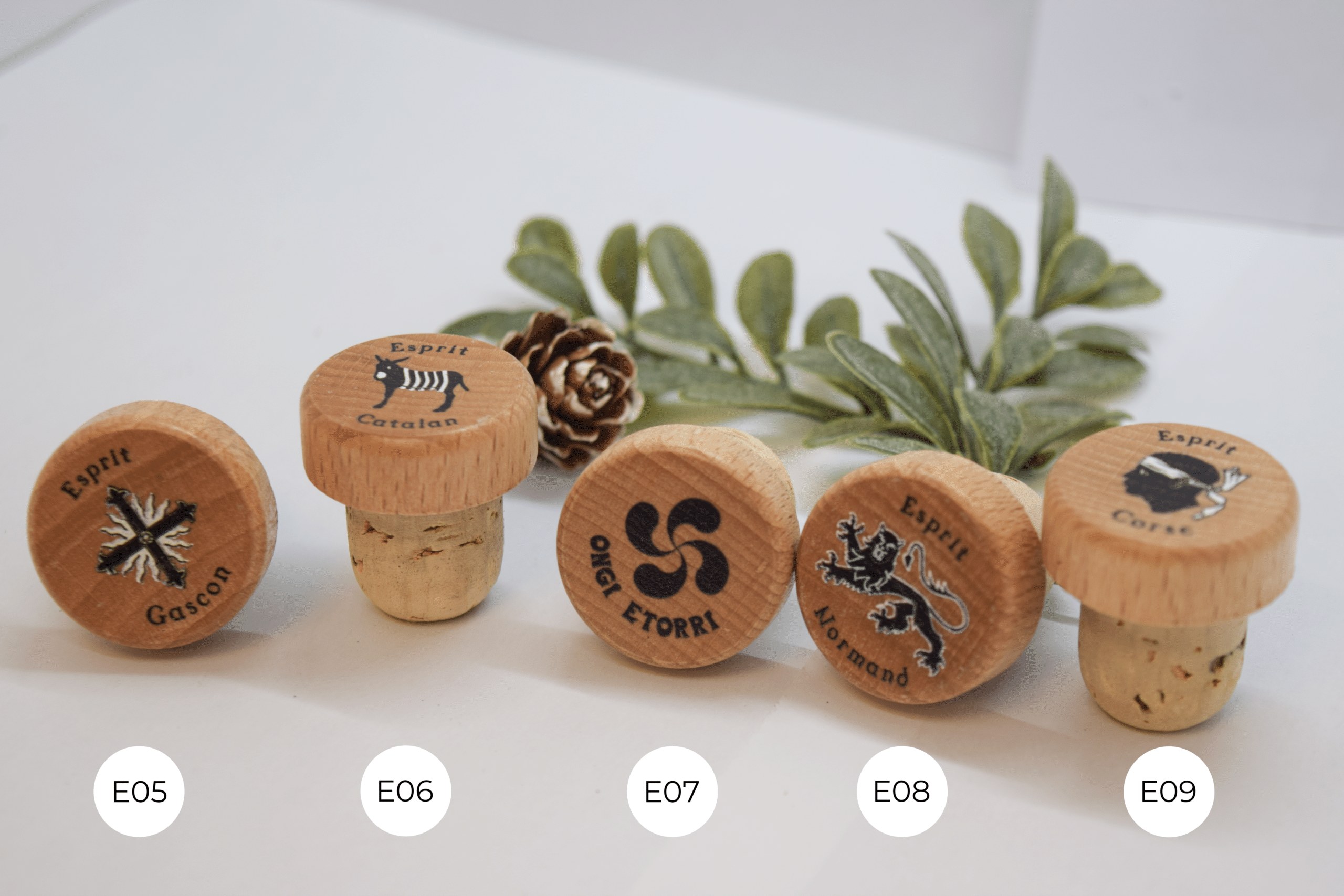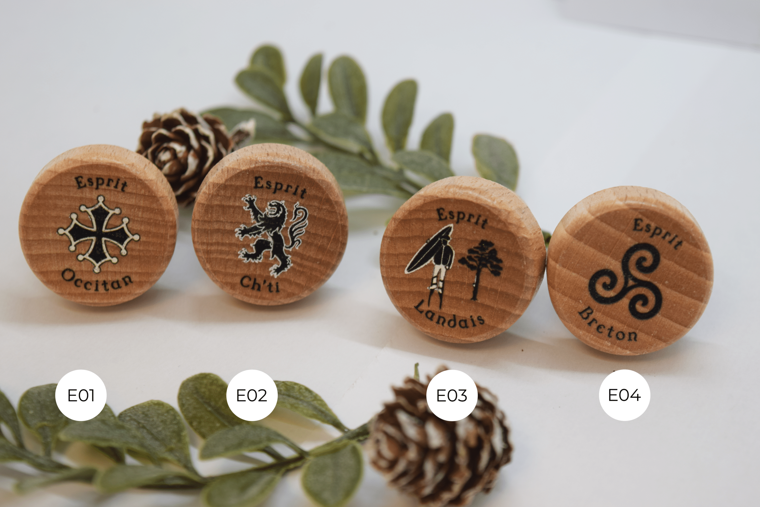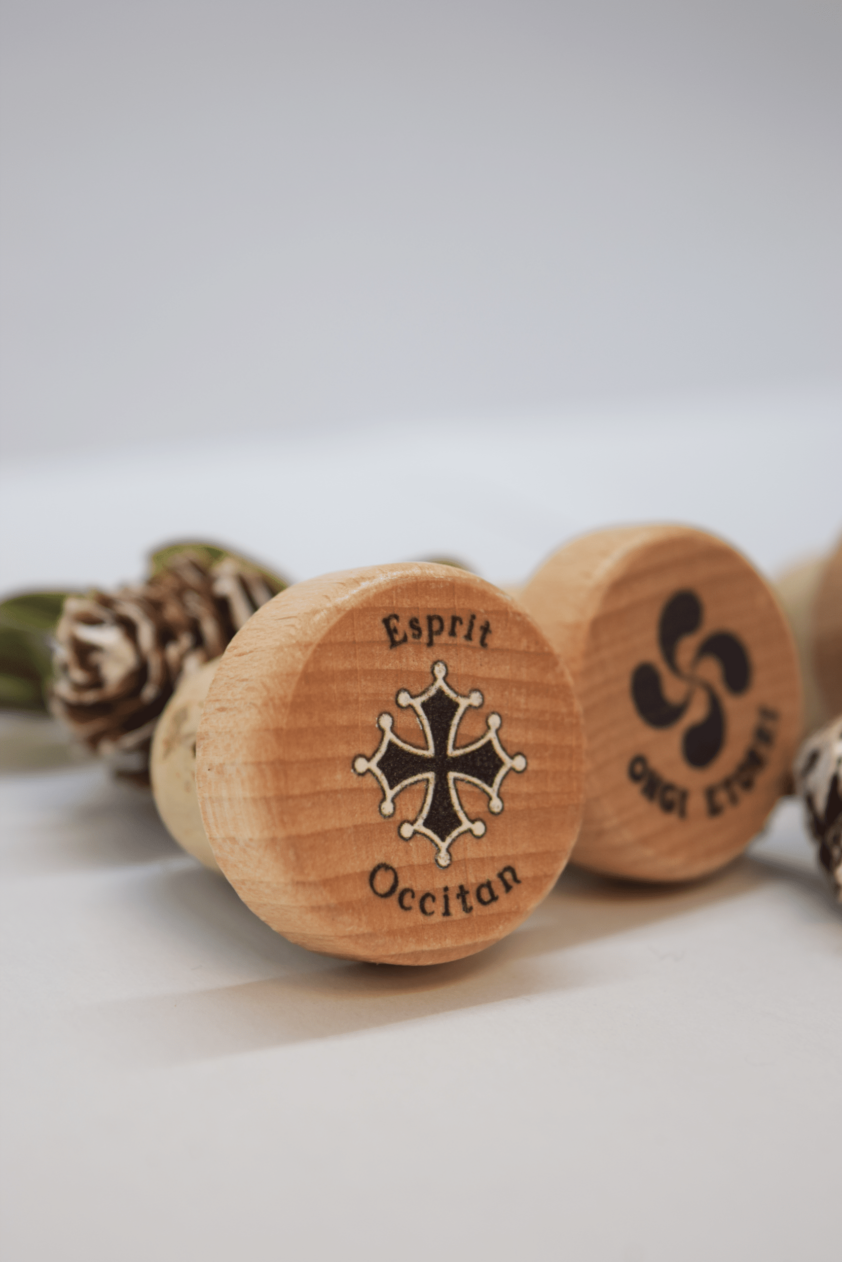 La Croix occitane et gasconne, le triskel breton, le lauburu basque, lion normand, la vache béarnaise, le drapeau corse et bien d’autres sont imprimés sur ces bouchons à tête bois vernis.