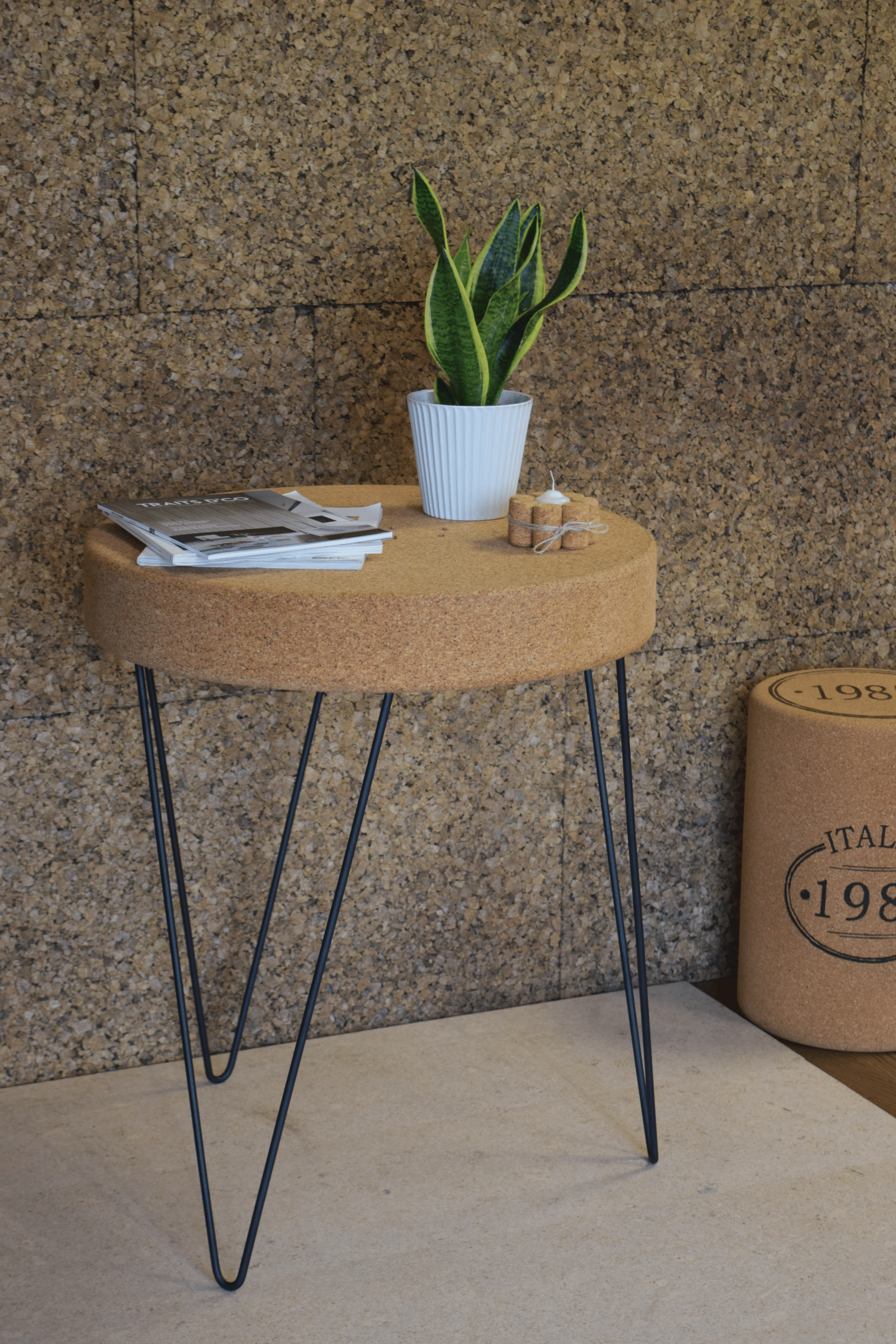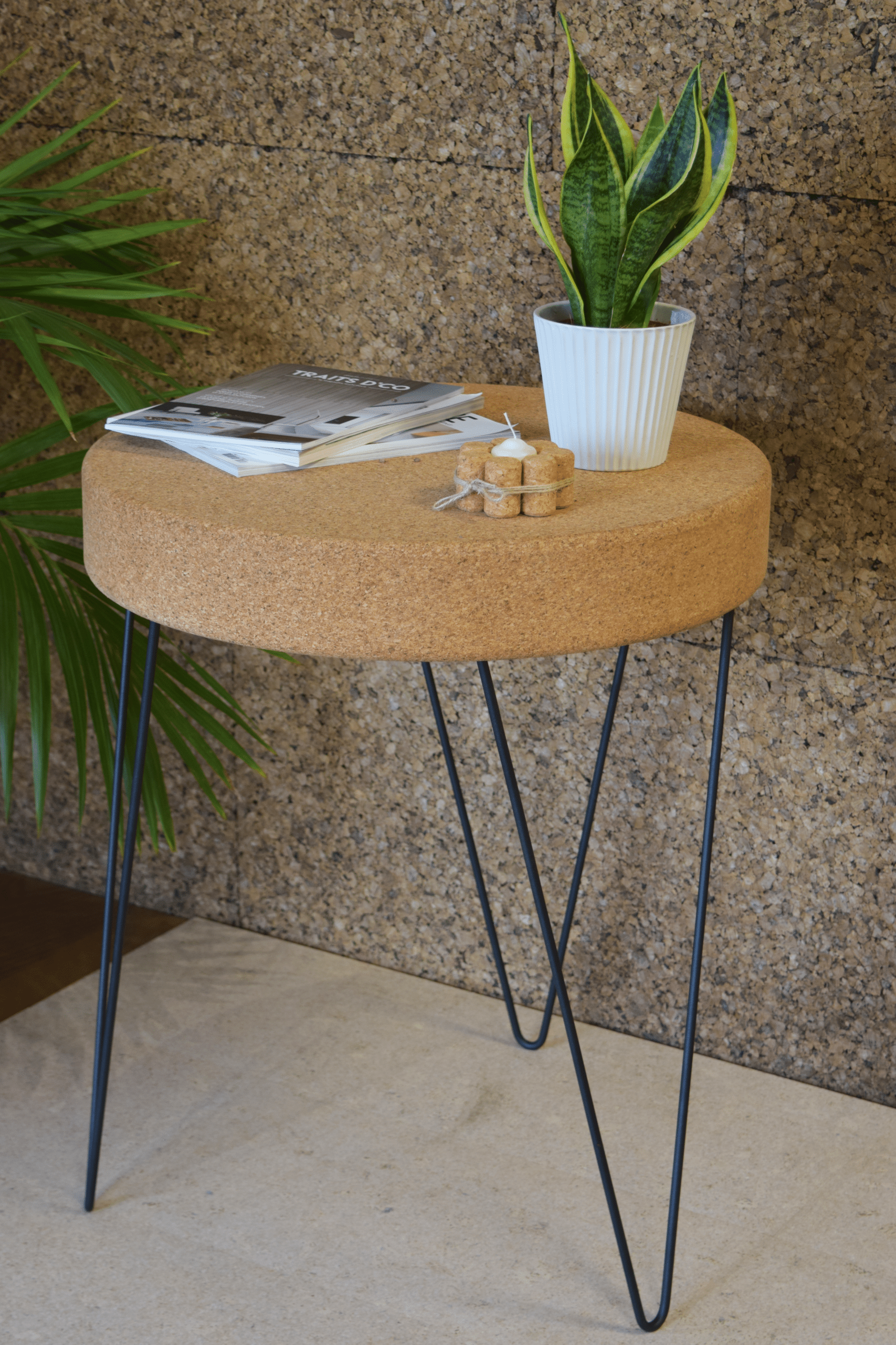 Le contraste liège / métal crée un jeu visuel harmonieux.
